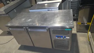 Mueble bajo mostrador de acero inoxidable con sistema de refrigeración. - Dos puertas frontales. - Dos cajones. - Superficie de trabajo de acero inoxidable.
