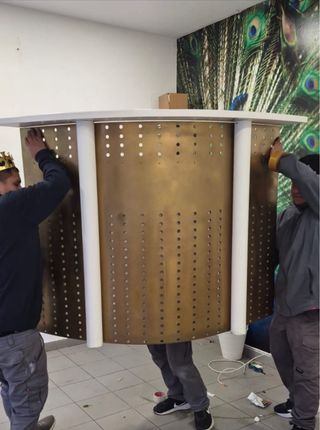 Mostrador con diseño moderno en blanco y dorado. Ideal para negocios o eventos. 145 alto hay una parte dentro del mostrador que mide 90 cm 140 ancho del mostrador Recogida zona usera c/Centeno 29 - Estructura principal en dorado con perforaciones. - Pilares de soporte en blanco. - Superficie superior blanco