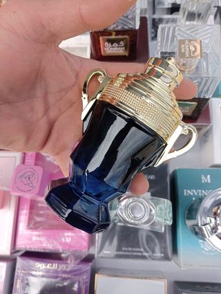 Frasco de perfume con un diseño elegante y llamativo. - Botella de vidrio azul oscuro. - Tapa y detalles dorados. - Forma de trofeo.