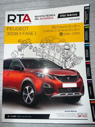 Revista técnica RTA para el Peugeot 3008 II Fase 1. Cubre modelos de 2016 a 2020. - Motores BlueHDi 150 y 180 cv. - Motores HDi 130 cv, 100 cv, 115 cv y 120 cv. - Incluye información sobre reparación y mantenimiento. - ISBN: 1134-7155.
