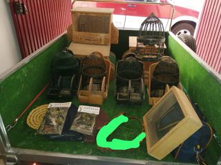 Conjunto de jaulas y jaulones de madera y metal, diseñados para perdiz de reclamo. - 5 Jaulas , una de ellas clara - 5 jauleros seminuevos - 5 Jaulones para pelecha - Puesto de camuflaje con 4 caras y silleta Regalo: Cobijas, soleros, cernidor y bolsa de deporte