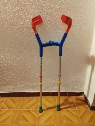 Par de muletas infantiles, diseñadas para niños. Son ajustables en altura y cuentan con empuñaduras ergonómicas. Compradas en junio de 2025 y usadas 5 días. Aún en garantía. - Color: Rojo y azul. - Material: Aluminio y plástico. - Empuñaduras ergonómicas. - Puntas de goma antideslizantes.