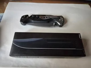 Navaja de la marca kabar hecha en china, es una navaja muy recia y pesada. Tiene muy poco uso y el filo en perfecto estado, la única pega es como se puede ver en la foto que el seguro se traba y hay que usar algo para desbloquearla. Por lo demás esta en perfecto estado.