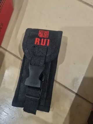 Navaja multiusos de la marca RUI, ideal para diversas actividades. - Hoja de acero con recubrimiento de titanio. - Mango con diseño ergonómico y detalles en gris. - Incluye funda de nylon y caja original.