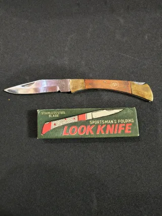 Navaja de bolsillo Look Knife de coleccionista, sin usar. Ideal para aficionados a la cuchillería. - Hoja de acero inoxidable. - Empuñadura de madera y latón. - Diseño Sportsman's Folding Knife.