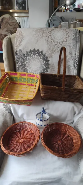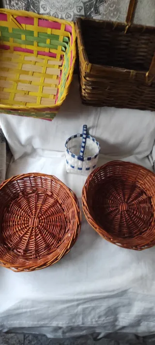 Conjunto de cestas de diferentes tamaños y materiales. - Cesta cuadrada de bambú multicolor (rosa, verde, amarillo). - Cesta rectangular de mimbre con asa. - Dos cestas iguales redondas de mimbre. - Cesta pequeña de mimbre con asa (azul y blanco) de pura srtesania, muy antigua y muy bonita.
