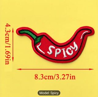 Parche bordado con diseño de chile picante. - Forma de chile rojo. - Detalle de tallo verde. - Texto Spicy bordado en blanco. Ideal para ropa, vaqueros y mochilas.