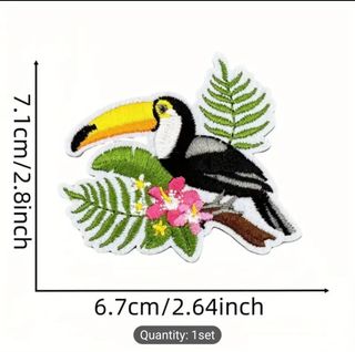Parche termoadhesivo con un diseño tropical de tucán y flores. - Detalle de tucán con colores vivos. - Incluye hojas verdes y flores rosas y amarillas. - Ideal para personalizar ropa o accesorios. Ideal para ropa, vaqueros y mochilas.