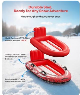 Trineo inflable diseñado para dos personas, ideal para disfrutar de la nieve. PRECINTADO. nunca usado - Asiento con respaldo. - Asas de agarre resistentes. - Diseño deportivo en color rojo con detalles blancos y estrellas.