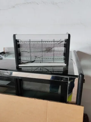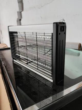 Dispositivo para eliminar insectos de forma eficaz. - Diseño rectangular con rejilla protectora. - Carcasa de plástico negro y metal plateado.
