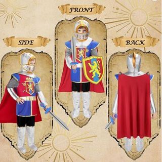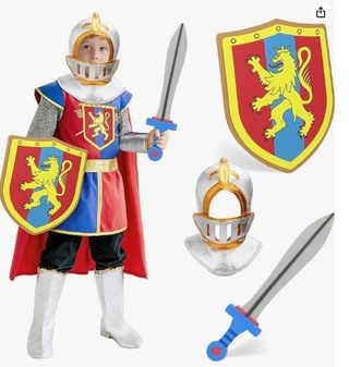 Disfraz de caballero para niños de 3 a 5 años. Incluye todo lo necesario para una aventura medieval. - Túnica con detalles de armadura. - Capa roja. - Casco de caballero. - Escudo con león. - Espada de juguete.