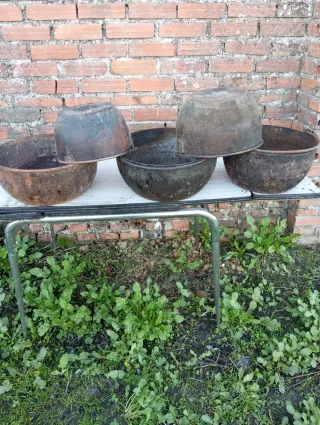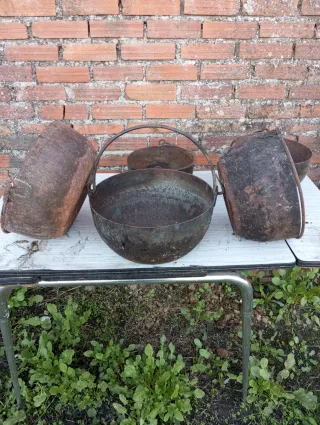 Conjunto de cinco calderos de hierro, cada uno de un tamaño diferente. - Fabricados en hierro - Diseño rústico y antiguo.