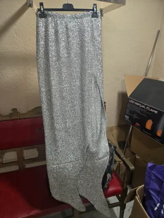 Falda larga con un acabado brillante en color plateado. Tiene una abertura lateral - Diseño de cola de sirena. - Tejido con purpurina. Ideal para carnaval...equivalente a una talla L