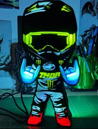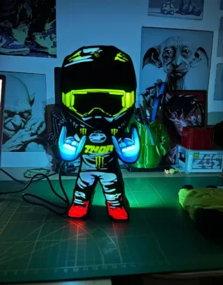 Preciosa lampara de piloto de motocross, con diseño único. - Es una pieza coleccionable. - Fabricada con materiales de alta calidad. - Iluminación LED integrada mediante USB y mando a distancia - Perfecta para decorar cualquier espacio. Pregunta sin compromiso