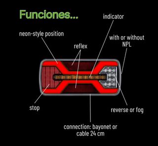 Pilotos traseros LED, nuevos. Ideales para mejorar la visibilidad de tu vehículo. -6 Funciones: intermitente, posición (efecto Neón)luz de freno, marcha atrás (el derecho), antiniebla (el izquierdo) - Estilo neón en la posición. - Con reflectante no triangular - Conexión: bayoneta o cable de 24 cm. 69 leds. IP67. Homologados CE,R10,R148, R150. 12-24V. Medidas 220x100 mm. 150 mm entre tornillos. Se puede montar horizontal o vertical