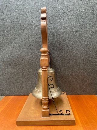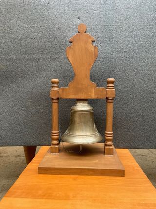 Preciosa campana antigua de bronce, ideal para decoración. Se incluye soporte de madera tallada. - Campana de bronce con pátina antigua. - Soporte de madera de estilo clásico. - Pieza única para decoración vintage.Venta en persona , no se hace envios . medidas de la campana sin mueble -alto 30cm , diametro 26cm , pesa 20kg . Medidas del mueble - alto 85cm , ancho 39 x 39 cm