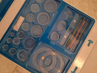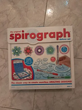 Set de dibujo Spirograph Deluxe con todo lo necesario para crear diseños. Aún incluye los bolígrafos originales y el papel original. - Incluye 10 ruedas Spirograph. - 2 anillos Spirograph. - 1 soporte para ruedas. - 1 soporte para anillos. - 1 bolígrafo. - 1 lápiz. - 1 adhesivo reutilizable. - 3 hojas de diseño. - 20 hojas de papel. - Estuche de almacenamiento con superficie de trabajo.