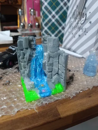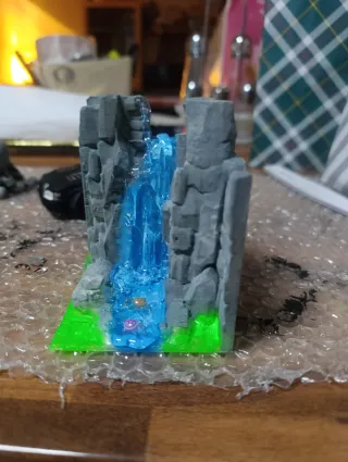 Miniatura detallada de una cascada con rocas y vegetación pintada a mano con mucho mimo - Diseño de paisaje con cascada azul. - Base verde simulando césped. - Figuras pequeñas en la base Con un toque especial,brilla en la oscuridad