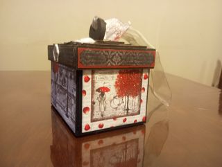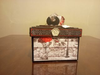 Caja decorada con un diseño romántico y vintage, ideal para guardar joyas o como álbum de recuerdos - Diseño con pareja bajo paraguas. - Detalles ornamentales en la tapa. - Acabado artesanal.