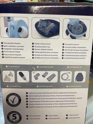 Nebulizador Alpha Neb de FLAEM, ideal para terapia de aerosol. - Unidad de terapia de aerosol para uso estacional. - Diseño compacto. - Incluye accesorios para su uso. - Fabricado en Italia..... solo la caja llegó mal cuando lo compré