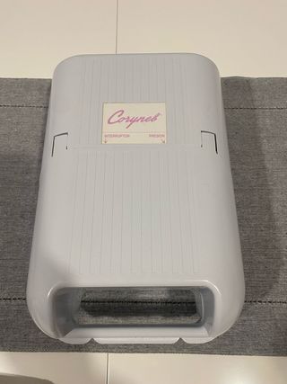 Nebulizador de aerosolterapia CORYNEB - Diseño en color blanco. - Incluye etiqueta con indicaciones 'INTERRUPTOR' y 'PRESION'.