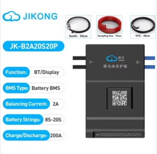 Protector de batería Jikong modelo JK-B2A20S20P. - Función: BT/Display - Tipo BMS: Battery BMS - Corriente de balanceo: 2A - Cadenas de batería: 8S-20S - Carga/Descarga: 200A - Incluye switch de 50cm, línea de muestreo de 70cm y NTC de 40cm.