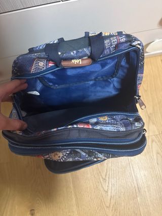 Mochila-maleta negra con ruedas, ideal para cabina. Valido para todas las aerolíneas sin tener que pagar extras Vueling, Ryanair, EasyJet... - Diseño resistente y funcional. - Asa extensible para facilitar el transporte. - Compartimentos organizados. - Los parches se pueden quitar