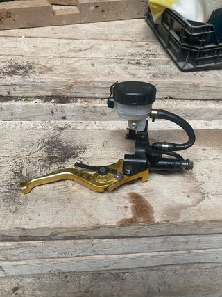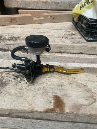 Bomba de freno delantera para motocicleta con maneta dorada. - Maneta de freno ajustable. - Depósito de líquido de frenos incluido.