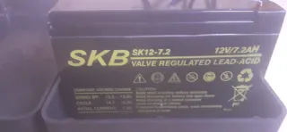 Batería de plomo-ácido sellada SKB. - Voltaje: 12V - Capacidad: 7.2AH - Tipo: VRLA (Valve Regulated Lead-Acid) - Carga en stand-by: 13.5 - 13.8V - Carga en ciclo: 14.7 - 15.0V - Corriente inicial: 1.6A
