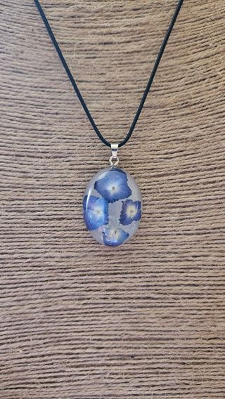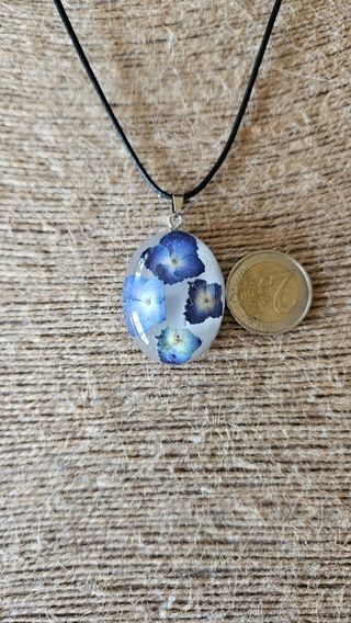Precioso colgante con flores de hortensia prensadas en resina. Es una pieza única y delicada. - Forma ovalada. - Flores azules y blancas. - Cordón negro.