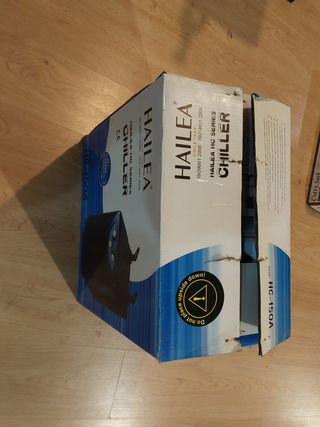 Enfriador de agua Hailea HC-150A para acuarios. Ideal para mantener la temperatura del agua estable. - Modelo: HC-150A - Marca: Hailea - Serie: HC Series - Certificaciones: ISO9001:2000, ISO14001:2004 - Incluye advertencia Do not place upside down!