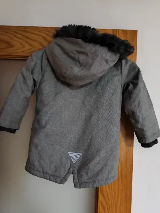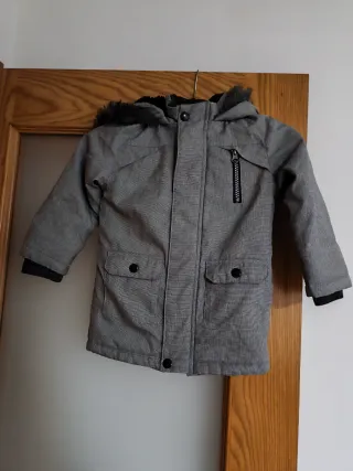 Chaqueta de invierno para niño con capucha y detalles de pelo sintético. - Color gris - Cierre de cremallera y botones. - Dos bolsillos frontales con botón. - Bolsillo adicional con cremallera en el pecho.