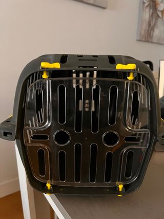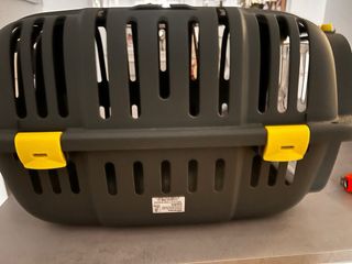 Transportín para mascotas, ideal para perros o gatos. Su diseño combina el color negro con detalles en amarillo. - Estructura de plástico resistente. - Puerta frontal de rejilla. - Ventilación lateral. 45x23