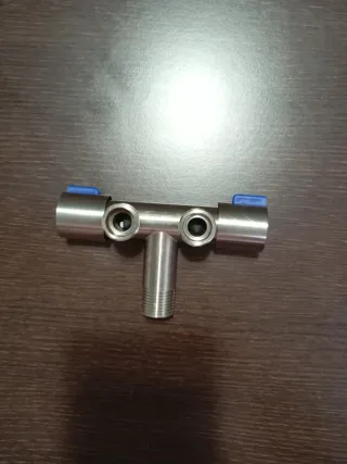 Válvula de control de metal con detalles en azul. - Fabricada en acero inoxidable. - Diseño compacto y funcional.