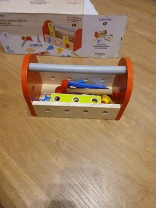 Caja de herramientas de madera de la marca Juguettos. No está completo, faltan algunas piezas - Incluye martillo, tornillos, tuercas y engranajes. - Edad recomendada: a partir de 18 meses. - Fabricado en madera.