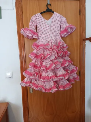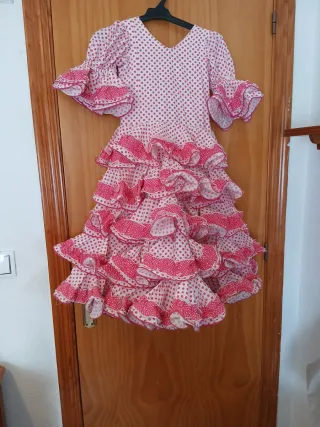 Precioso traje de flamenca para niña con un alegre estampado de lunares. - Diseño con volantes. - Mangas con volantes. - Estampado de lunares rosas sobre fondo blanco. Para niña de 6/7 años, hecho a mano, largo desde los hombros 95cm Ancho 64cm Tiene para sacarle de largo unos 5cm más.