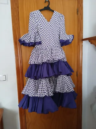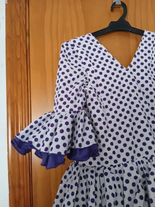 Traje de flamenca con un alegre estampado de lunares morados sobre fondo blanco. El diseño cuenta con volantes y un estilo muy tradicional. - Cuerpo con escote en V. - Mangas acampanadas con volantes. - Varias capas de volantes en la falda. Talla 8/10 años, hecho a mano, tiene para sacarle 3 o 4 cm de largo y un par de ancho. Largo desde los hombros 110cm Ancho de cintura 74cm