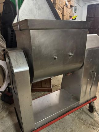 Amasadora de acero inoxidable para carnicería. Ideal para mezclar ingredientes de forma eficiente. - Construcción robusta en acero inoxidable. - Diseño funcional para fácil limpieza. - Equipada con ruedas para movilidad.