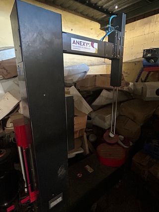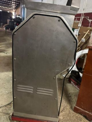 Máquina embaladora semiautomática para cajas. - Estructura robusta de color gris oscuro. - Panel de control rojo. - Cilindro negro en la base.