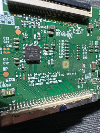 Sacada de televisor TD SYSTEMS K32DLM8HS con pantalla rota - Modelo: 5802AH - Número de parte: 32 6871L-5802AHDAWTGP295 - Fabricante: LG Display Co., Ltd. - Modelo de placa: 3D/37 R07.1 HD VER. 0. - Fecha de diseño: 2012/08/18