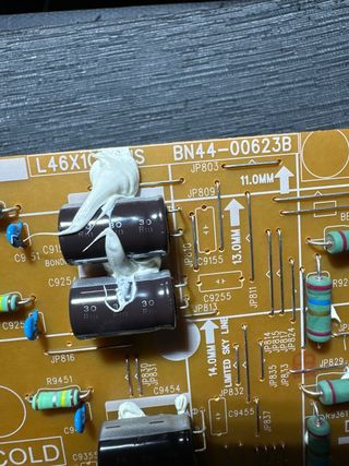Sacada de televisor SAMSUNG UE46F6500SS con pantalla rota - Modelo BN44-00623B. - Componentes electrónicos visibles en la placa.