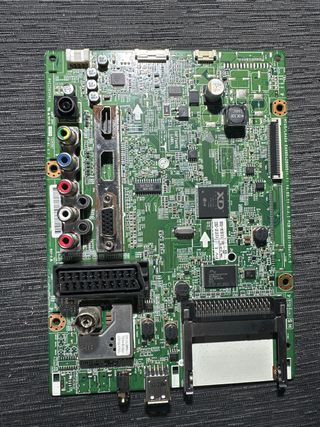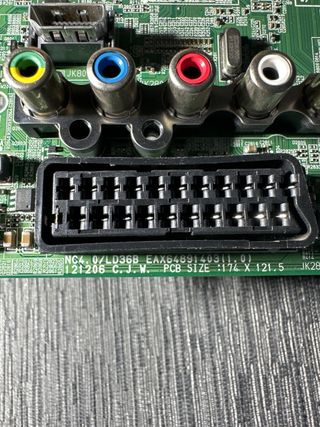 Sacada de televisor LG 32LN540B con pantalla rota - Componentes electrónicos variados. - Conectores de entrada y salida. - Transformador amarillo. - Condensadores de diferentes capacidades.