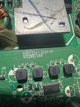 Sacada de televisor ENGEL LE2490ATV con pantalla rota - Componentes electrónicos verdes. - Conectores de entrada y salida. - Disipador de calor negro.
