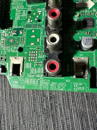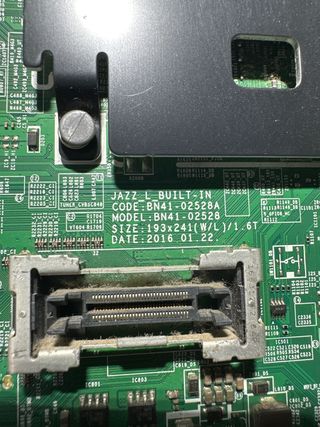 Sacada de televisor SAMSUNG UE43RU7105K con pantalla rota. - Componente electrónico principal. - Conexiones de audio y video. - Puerto Ethernet. - Módulo Wi-Fi integrado.