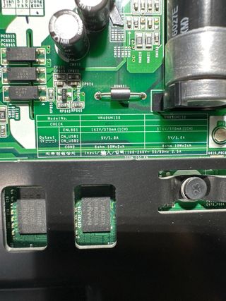 Sacada de televisor SAMSUNG UE43NU7025K con pantalla rota - Componentes electrónicos visibles. - Conectores de entrada y salida. - Diseño compacto.