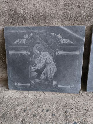 lápidas de granito negro, elaboradas artesanalmente. también disponemos de mármol blanco de Macael - Grabados: Virgen María con Sagrado Corazón y Cristo crucificado. - Material: Granito negro y mármol blanco - Estado: Nuevas. El precio es por unidad y tal cual se ven en las fotos. Si hay que añadirles algo más se incrementaría