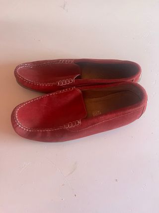 Vendo un par de zapatos de verano de color rojo. Son de ante y tienen un diseño elegante y sencillo. - Color rojo. - Material: ante. - Estilo mocasín. - Costuras blancas.