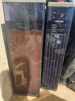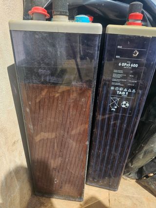 12 Baterías de plomo de la marca TAB, modelo 6 OPzS 600. - Voltaje nominal: 2 V. - Capacidad nominal (C10): 600 Ah. - Densidad del electrolito: 1,24 ± 0,01 kg/l. - Voltaje de flotación: 2,23 V ± 1%.