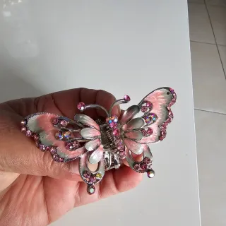 Bonito pinza para pelo con forma de mariposa decorado con pedrería. - Diseño de mariposa. - Detalles en pedrería rosa y abalorios. - Acabado plateado y esmaltado en rosa y blanco.