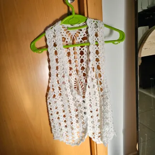 Chaleco de crochet blanco, ideal para añadir un toque bohemio a tu look. Cierre con botones.talla 46 - Diseño calado. - Tejido a mano. - Dos botones frontales.